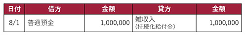 一例として、個人事業主として持続化給付金が銀行口座(普通預金)へ最大給付額である100万円入金された場合、仕分けは「借方勘定科目」が普通預金、「借方金額」が100万円として計上します。「貸方勘定科目」は雑収入を選択しましょう。「貸方金額」は同じく100万円、そして「摘要」の項目には持続化給付金と記載すれば完了です。