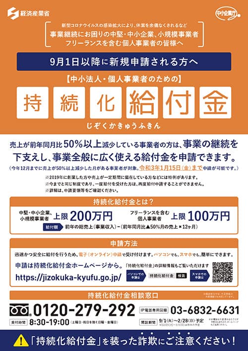 2020年に入り、コロナウイルスの影響によって多くの企業が業績悪化に直面しています。日本政府は事業者向けの援助策として4月7日に「持続化給付金」を発表しました。「コロナ給付金」と呼ばれることもあるこの制度を活用することにより、法人であれば最大200万円、個人事業主であれば最大100万円の援助金を受け取ることができます。