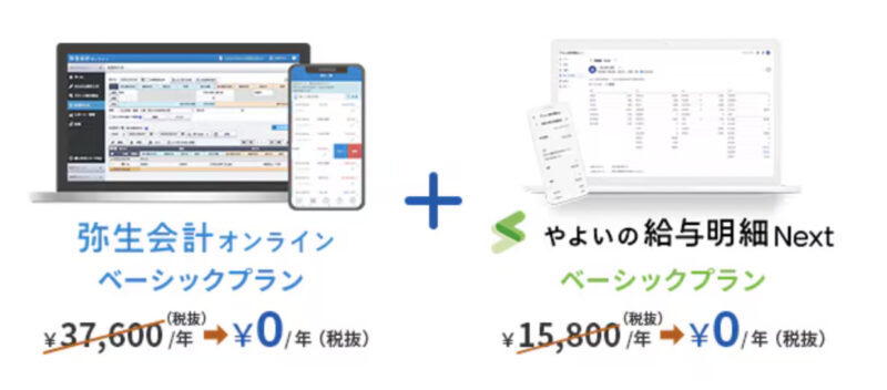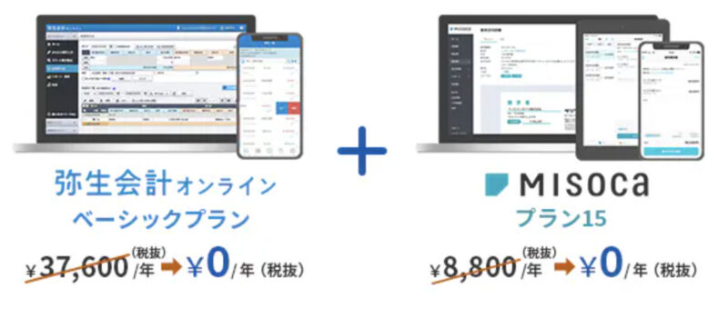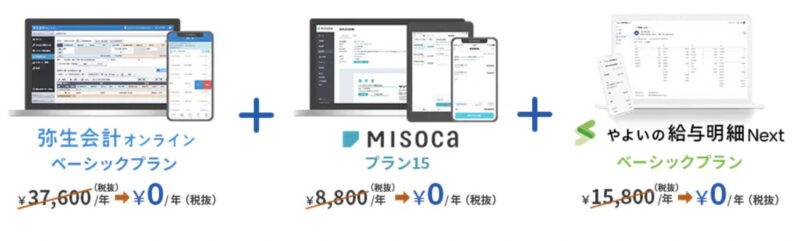 只今、「弥生会計 オンライン」の有償プランと見積書・納品書・請求書作成ソフト「Misoca」、「やよいの給与明細 Next」の有償プランを1年間無償でご利用いただけるキャンペーンを実施中です。