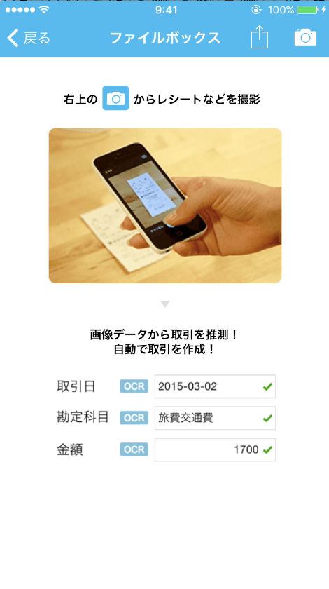 その場合は受け取ったレシートをスマホのカメラでパシャっと撮影すれば、書いてある内容をOCR機能で文字として認識して、データを取り込んでくれます。