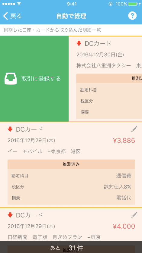 自動経理機能で、仕訳項目が入力されているので問題がなければ右にササッとスワイプすると登録されます。