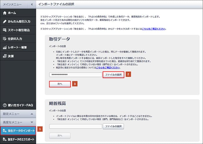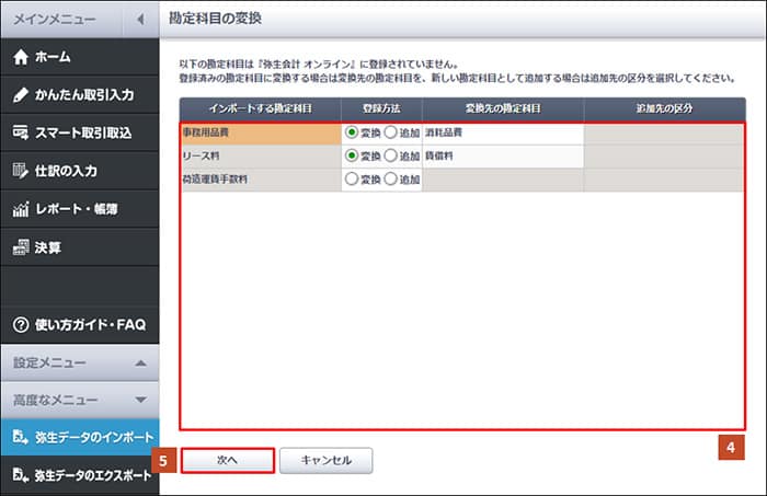 弥生会計のメインメニューの左にある「高度なメニュー」を選び「弥生データのインポート」をクリックします。ファイルを選択できますので、保存してあるファイルを選んで「次へ」をクリックします。弥生会計のデフォルトにはない勘定科目や補助科目がその中に含まれている場合は、次にそのリストが表示されます。