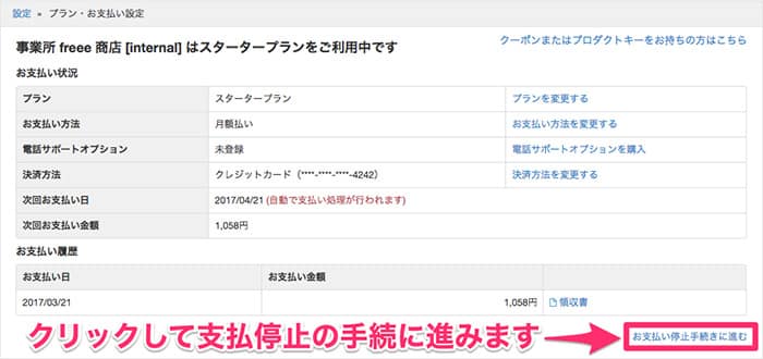 これで会計freeeの有償プランは利用できなくなりますので、処理がなされているかをチェックしましょう。設定の「プラン・お支払い設定」項目を開いて、支払いが停止中であるという表示が出ているかを確認することで、処理が正常になされたことを確かめられます。