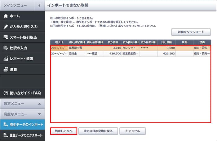 これで処理は終了となりますので、データ移行がきちんとなされているかを仕訳書などの項目から確認してみましょう。同じように、「弥生データのインポート」メニューから、開始残高などのデータもインポートすれば、すべての会計データを移行できます。ファイルの中にはインポートできないデータが含まれていることもあり、その場合はインポート開始の前に処理を尋ねられます。新しい科目を作るなどして対応しましょう。