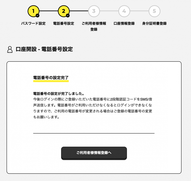 次は電話番号認証です。こちらに自分の電話番号を入力すると、SMSで認証コードが発行されます。(固定電話でも可能です。固定電話の場合は音声にて認証コードが発行されます。)
