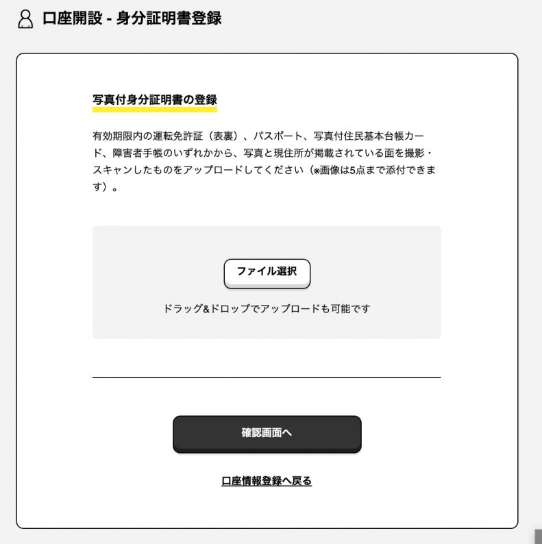 運転免許証、パスポート、写真付き住民基本台帳カード、障害者手帳のいずれかの画像が必要です。