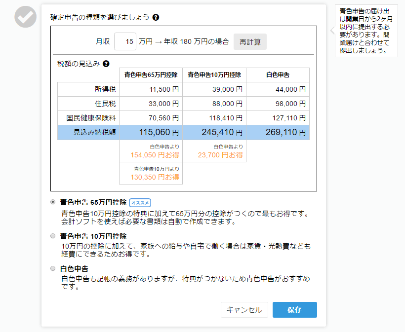 やっぱり白色申告でいくか、青色申告でいくか?10万円控除か65万円控除か迷うのですが、ここでは実際にどれぐらいの所得税・住民税・保険料になるかを試算してくれて、どれぐらい節税メリットがあるのかまで提示してくれます。