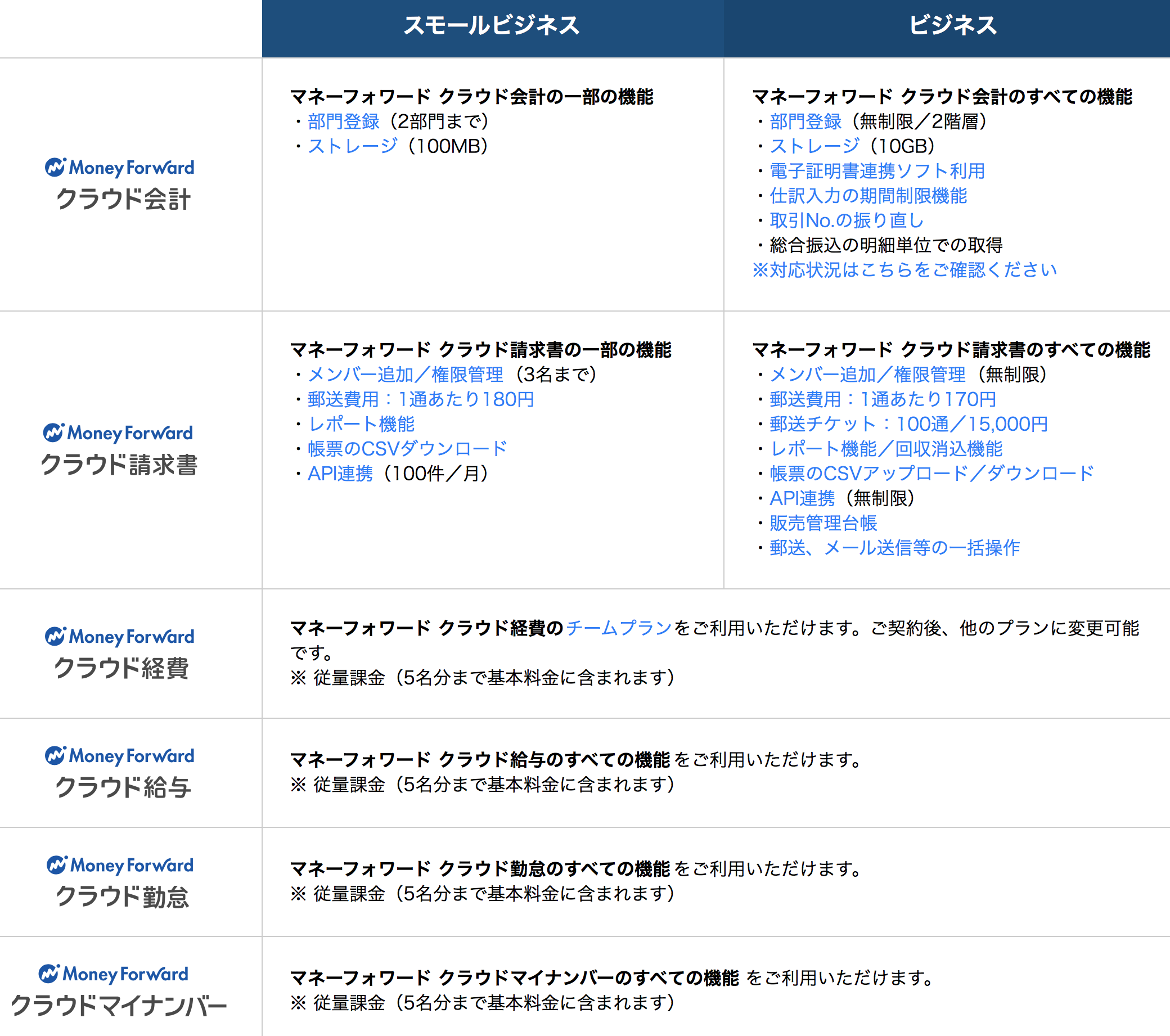 freeeでは経理と労務とで二つのサービスの連携だけでしたが、マネーフォワードクラウドは「マネーフォワードクラウド会計・確定申告」、「マネーフォワードクラウド請求書」、「マネーフォワードクラウド給与」、「マネーフォワードクラウド経費」、「マネーフォワードクラウドマイナンバー」、「マネーフォワードクラウドファイナンス(資金調達)」、「マネーフォワードクラウド消込」と様々なサービスを展開しています。