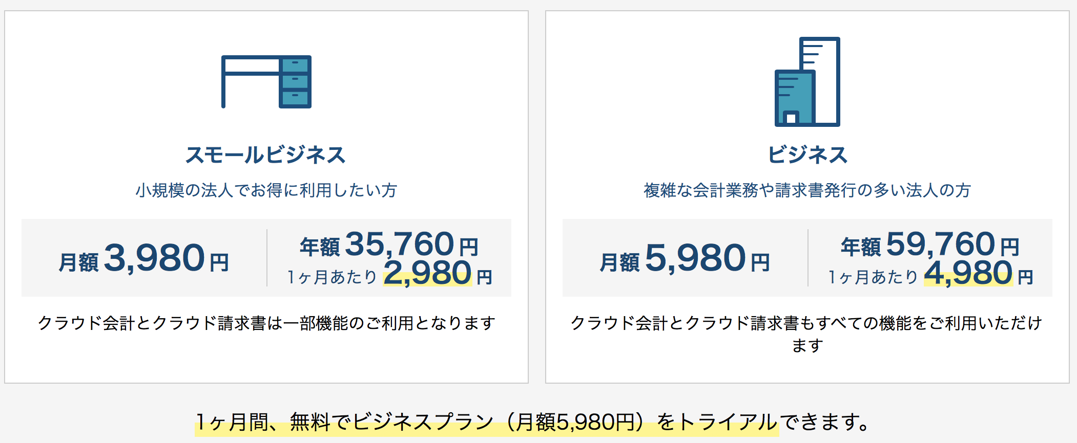 スモールビジネスプランはfreeeと比較すると年払いで月額1000円安くなります。